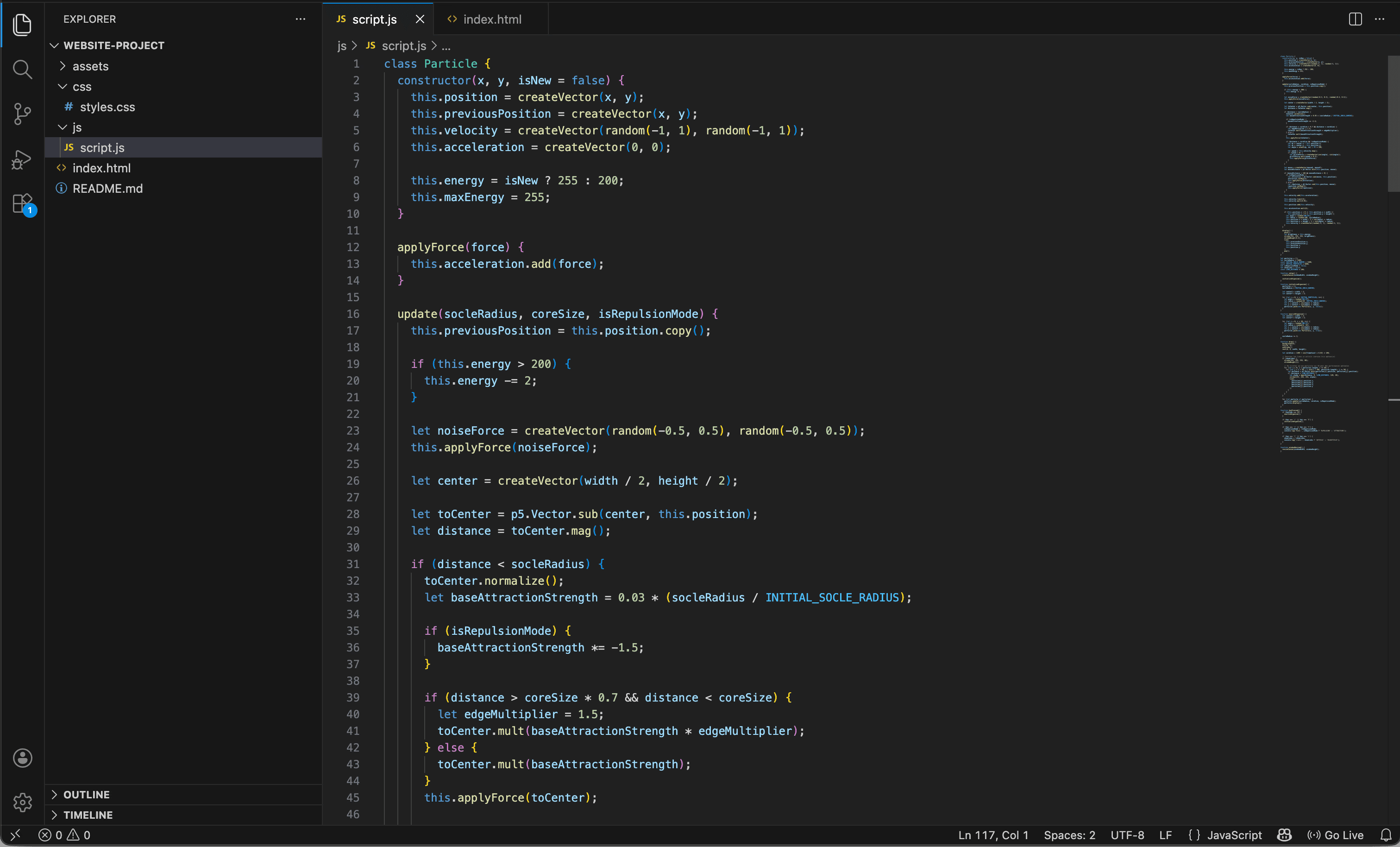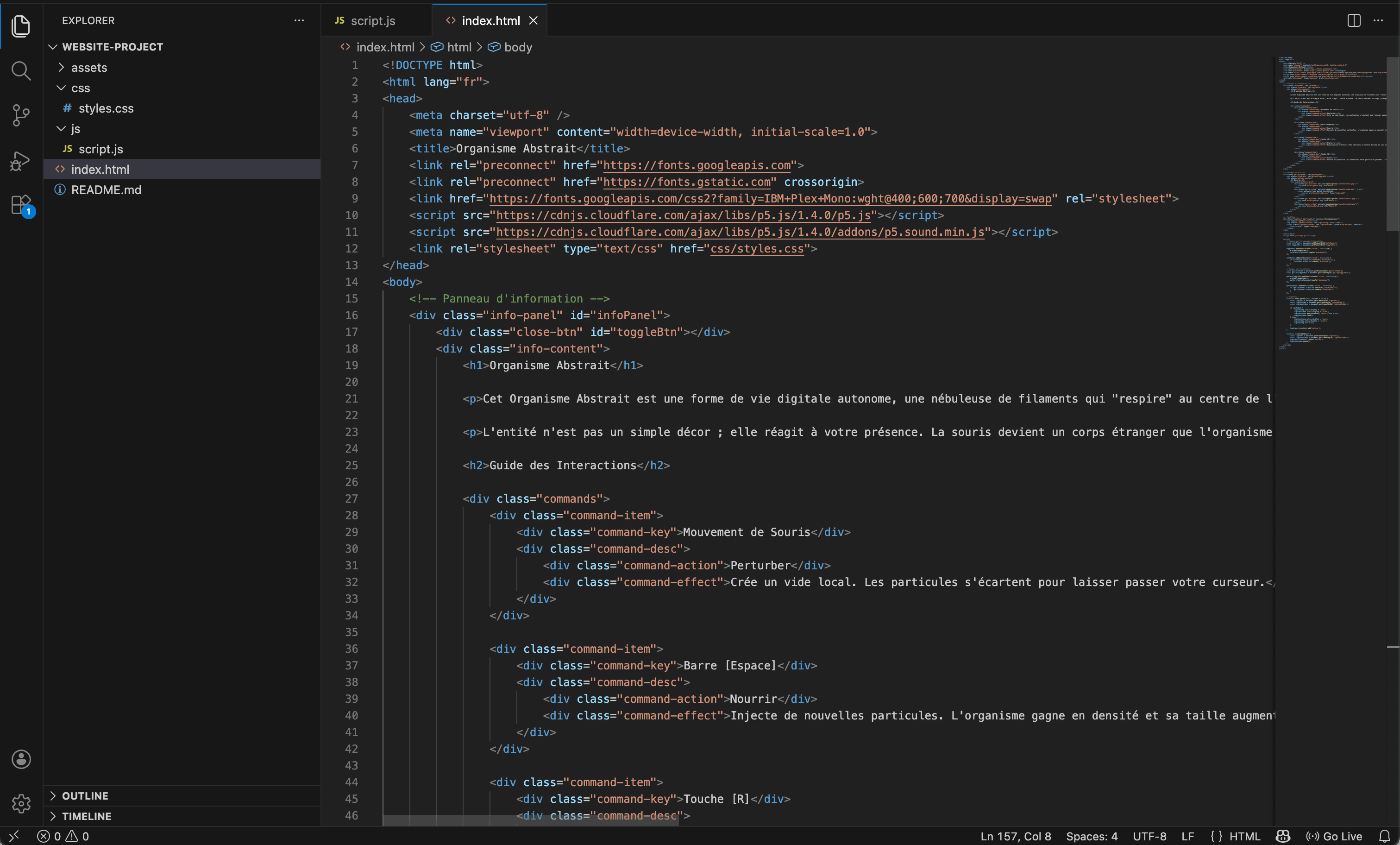 Le résultat final est une expérience interactive où l'utilisateur n'est plus simple spectateur, mais acteur de l'équilibre du système. Par le mouvement de la souris, on peut perturber l'organisme, tandis que le clavier permet de le nourrir ou de révéler sa structure interne par un réseau de liens. Pour mettre en valeur ce travail, j'ai conçu un mini-site épuré sous forme de panneau d'information rétractable, permettant une immersion totale dans le sketch tout en offrant un accès clair aux intentions de design et à une galerie de captures du projet.